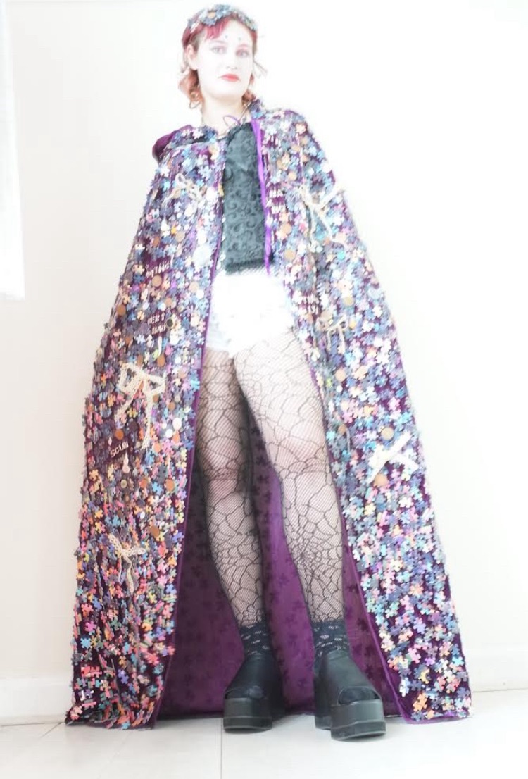 This poem is one of the pieces that came out of this experiment. This piece started with a poem that I wrote myself, which I melded into a kind of hanging ‘comic book’ piece with watercolour illustrations of the poem. The piece itself was cast in pewter that I collected and recycled in old pieces, using a mold that I hand cast using clay to accommodate the pieces of poem inside of it snuggly. I also developed a performance piece which I read the poem dressed as my evil alter ego, with a cape made up of over 3,000 pieces of jig saw. The performance piece was debuted at Cal De Cabaret, and the sculpture was exhibited at Spellbound MCR.